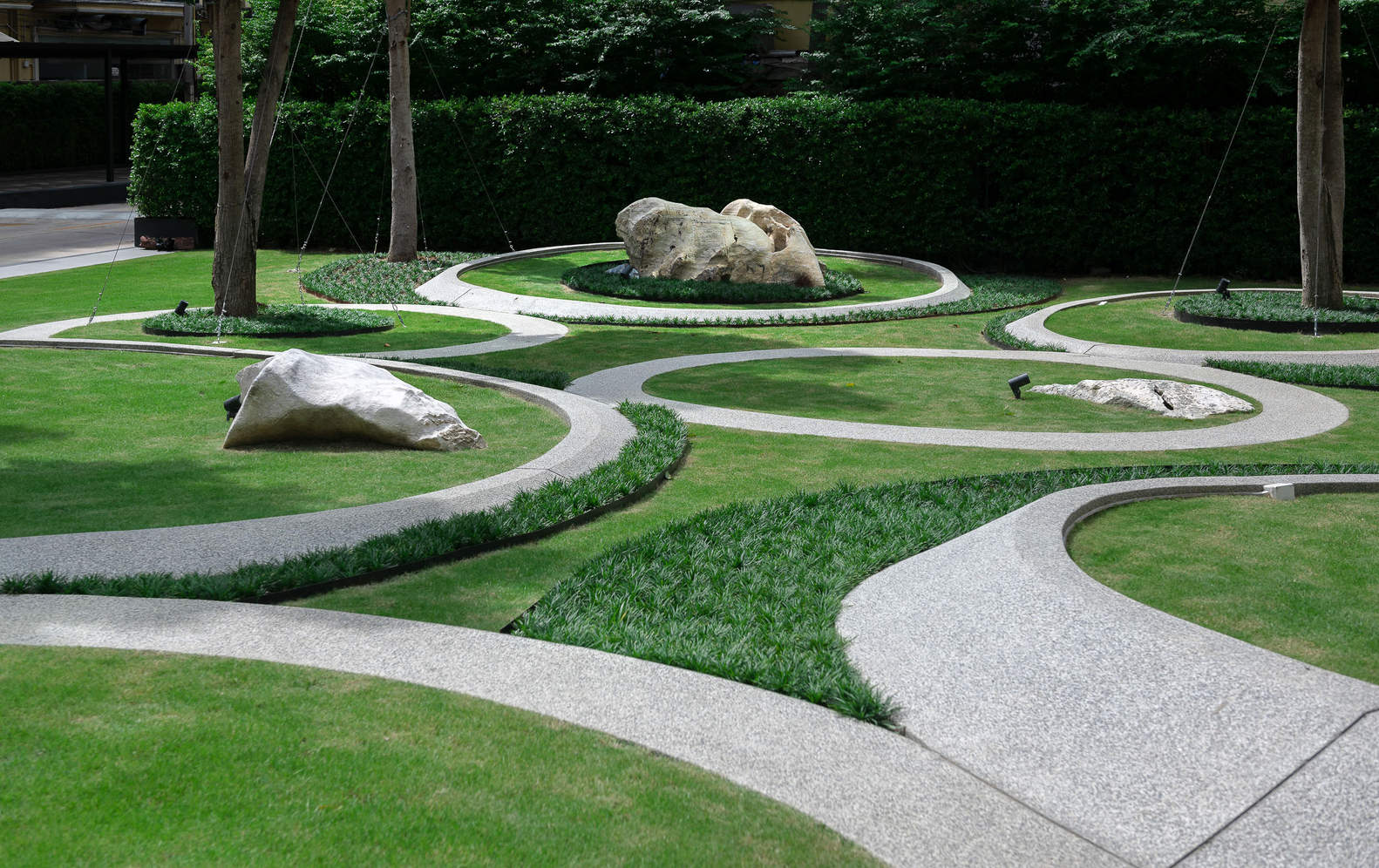 Through a minimalist design approach, the shape of water is symbolically designed as raindrops on a calm surface. Circular ripples, composed of neatly trimmed shrubs, sculptural trees, and concrete curbs, flow throughout the garden. As night falls, strip lighting hidden within the curbs emits a soft glow to highlight the carefully placed Feng Shui stones, while tall trees are bathed in strategically positioned uplighting.
