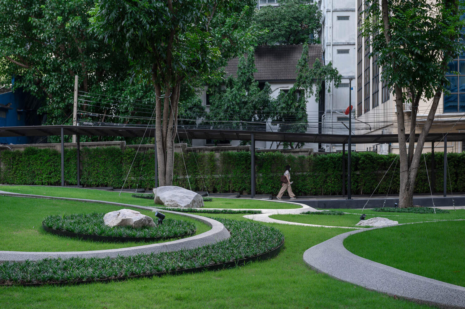 场地向中国文化致敬,风水在设计空间规划中起着至关重要的作用。在风水思想中,水通常被视为不可或缺的一部分,尤其是房屋前面的区域,然而,由于公共空间对水景有限制,我们替换了对于“水”的表达。我们思考了水如何作为一种媒介,促进并最终塑造景观艺术。庭院以泰国 CC 塔为背景,硬景和软景和谐地构成,宛如一幅中国山水画。